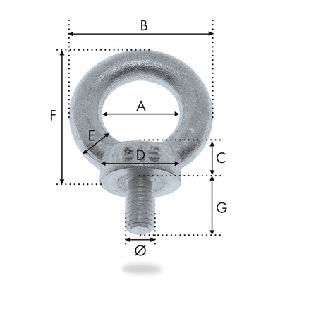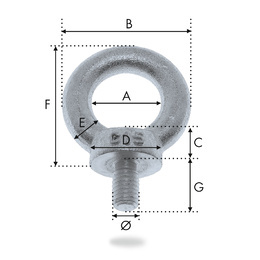 | REF. | Ø (mm) | C.M.U (kg) | A (mm) | B (mm) | C (mm) | D (mm) | E (mm) | F (mm) | G (mm) | Poids / 100p (kg) |