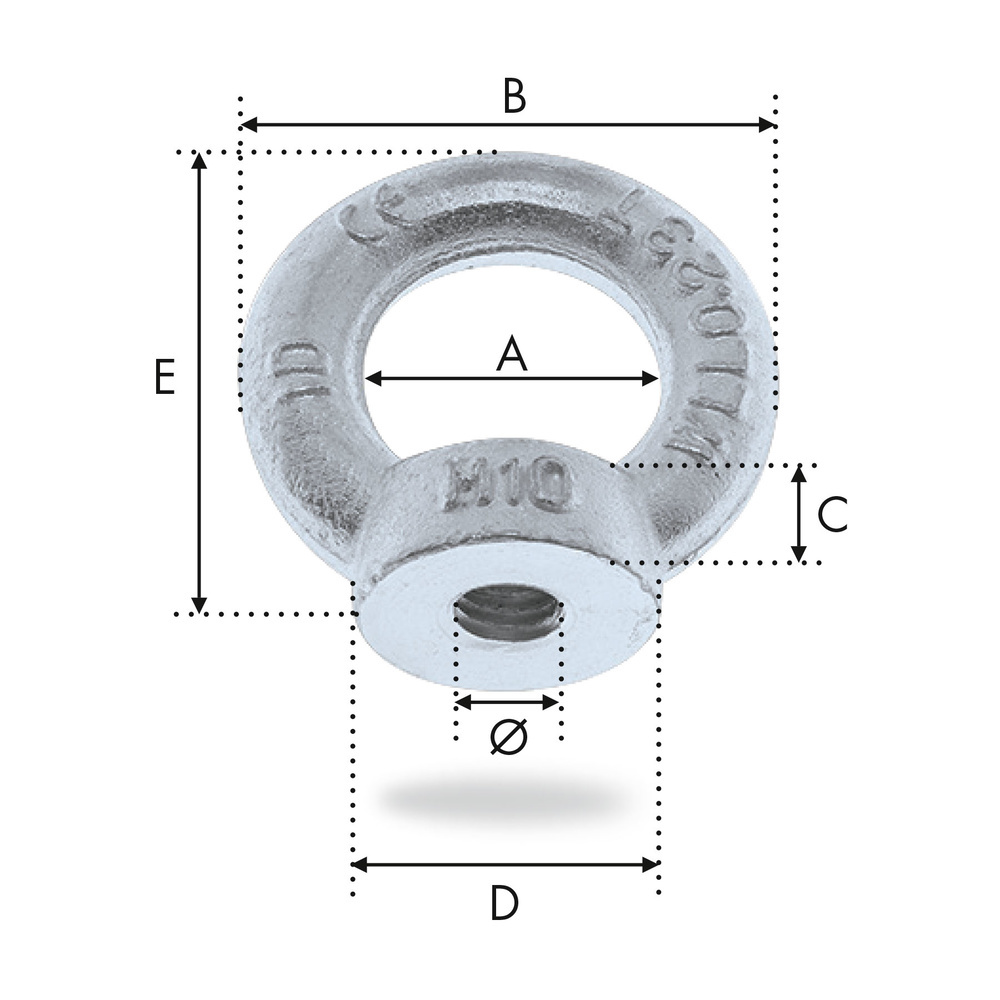| REF. | Ø (mm) | C.M.U (kg) | A (mm) | B (mm) | C (mm) | D (mm) | E (mm) | Poids / 100p (kg) |