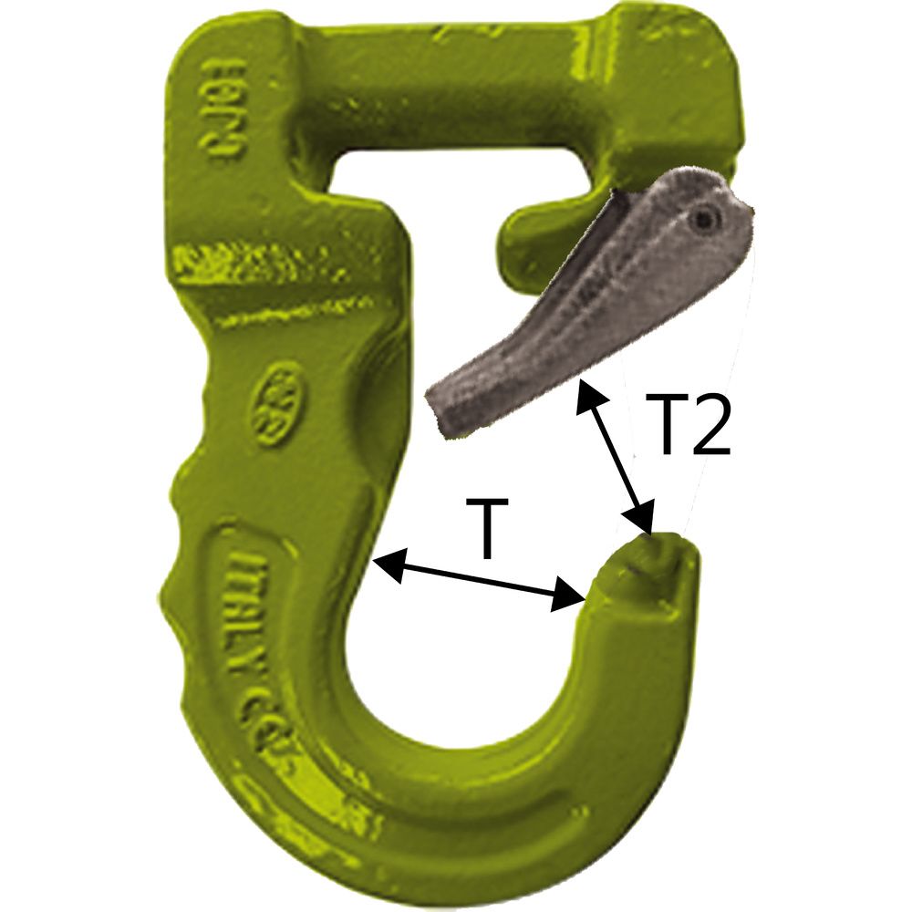 L'ouverture du crochet à linguet (dimensions T1 et T2) et le passage plat du crochet pour élingue textile (dimenions D) sont bien en accord avec la largeur de l'élingue textile (à CMU identiques), qu'elle soit une élingue tubulaire ou élingue à 2 boucles.