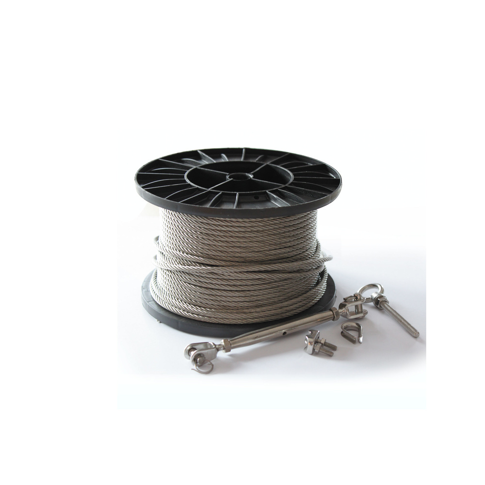 Pack garde-corps inox AISI 316 : • 50 mètres de câble inox Ø 4 mm • 20 x serre-câble inox • 10 x cosse-cœur inox • 5 x ridoirs inox • 10 x pitons boulon inox Garantie 1 an