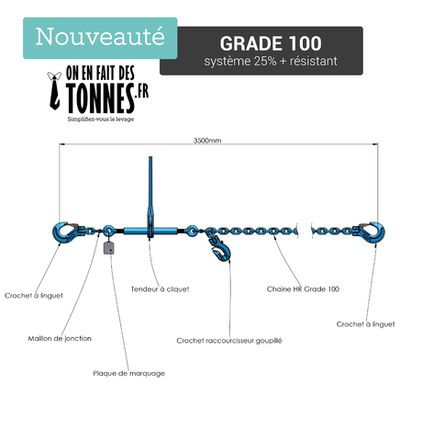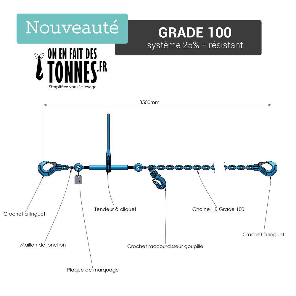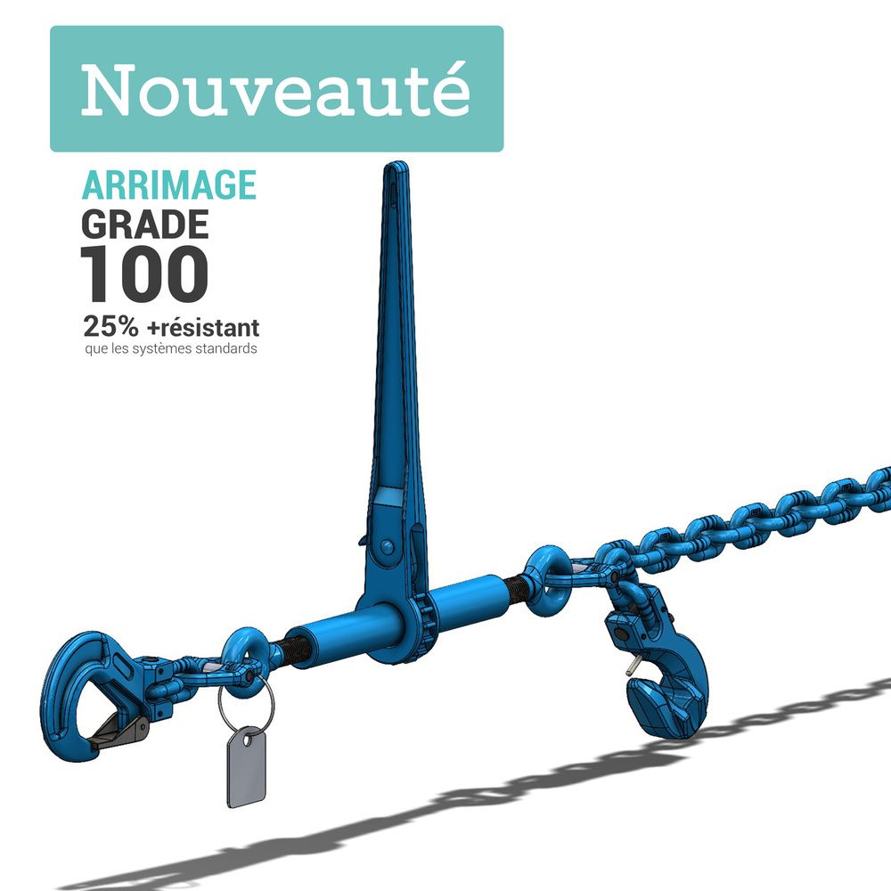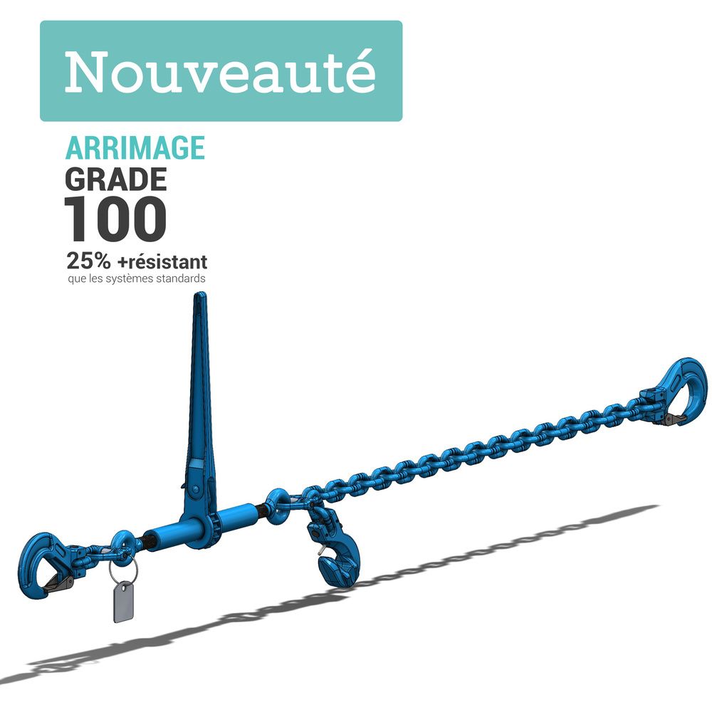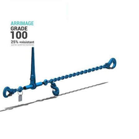 Le système d'arrimage complet Grade 100 en 1 partie avec tendeur pour chaine à cliquet intégré et crochets Grade 100 (ou classe 10) est destiné aux opérations d’arrimage dans le cadre de transport routier, maritime ou aérien. Ce système clé en main permet d’amarrer et de sécuriser le chargement.