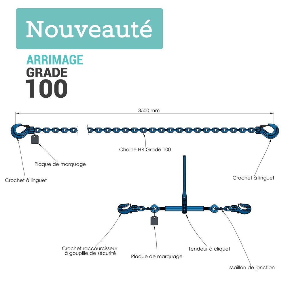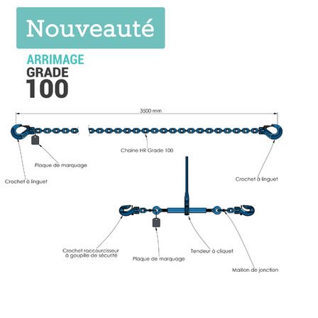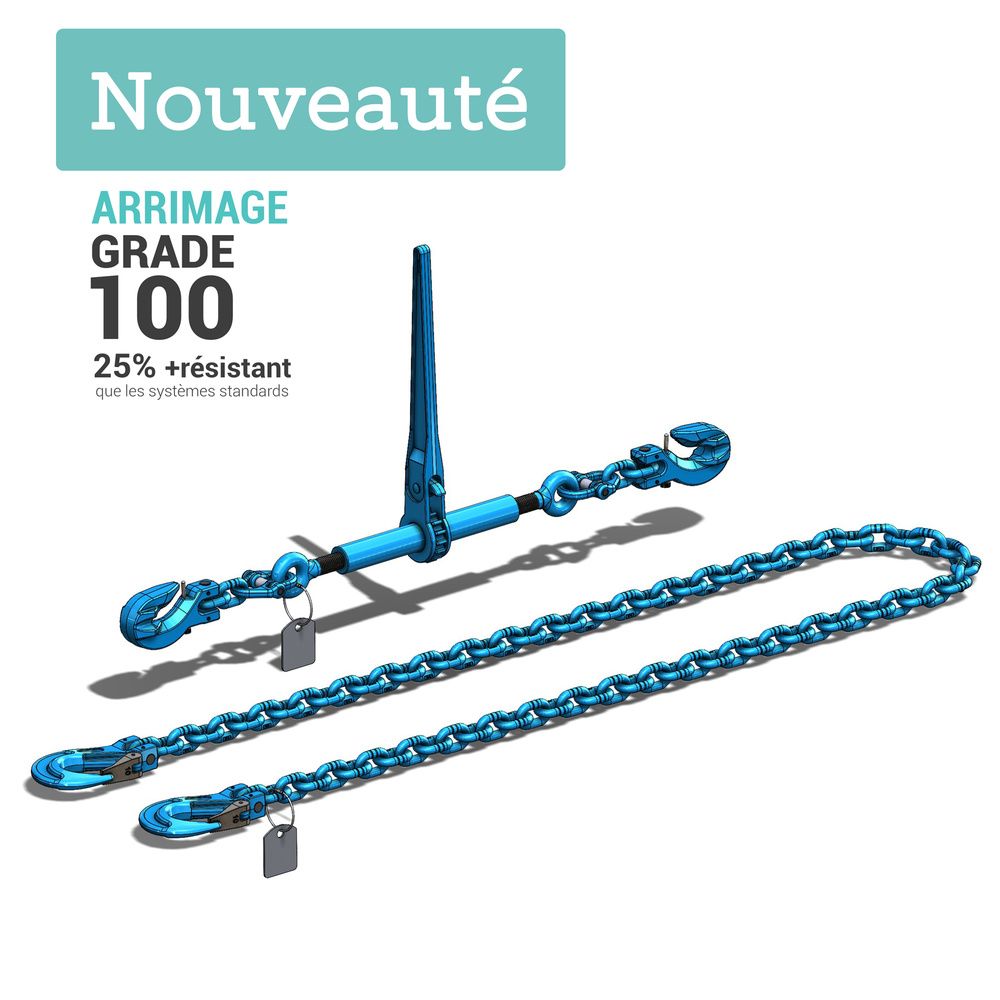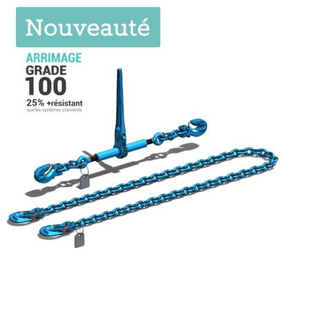 Le système d'arrimage complet Grade 100 en 2 parties avec tendeur à cliquet à crochets raccourcisseurs et chaîne d’arrimage Grade 100 (ou classe 10) est dédié aux activités d’arrimage dans le cadre de transport routier, maritime ou aérien. Ce système en deux parties complémentaires mais aussi indépendantes permet d’amarrer et de fixer solidement votre chargement.